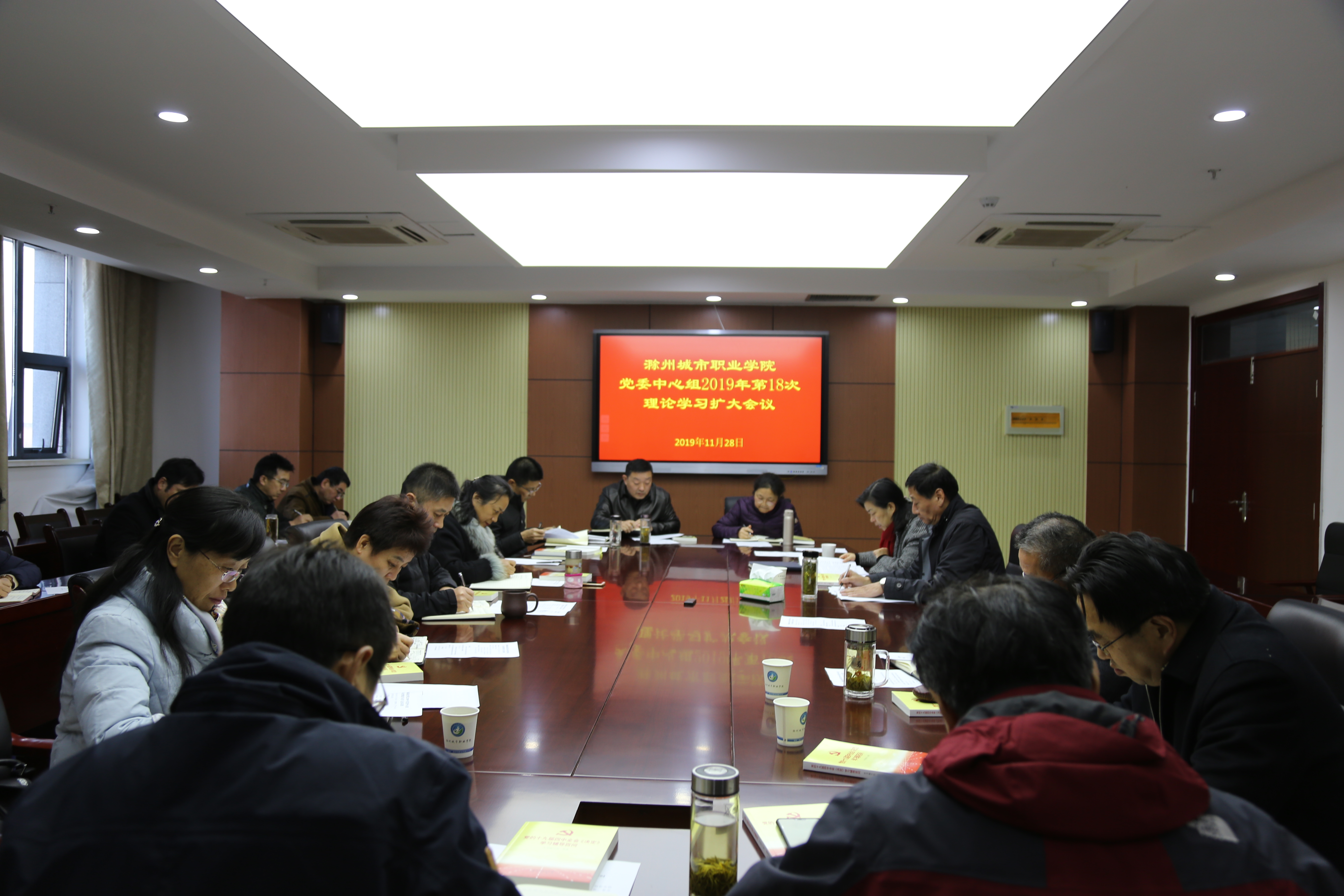 11月28日下午,学院党委中心组2019年第18次理论学习扩大会议在图文中心第四会议室召开,会议深入学习了习近平总书记在党的十九届四中全会上的重要讲话和《中共中央关于坚持和完善中国特色社会主义制度、推进国家治理体系和治理能力现代化若干重大问题的决定》,并就学院贯彻落实全会精神、推进学院内部治理能力提升进行专题研讨。党委书记米德成主持会议并带头进行交流发言。