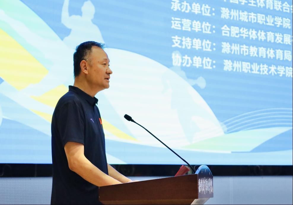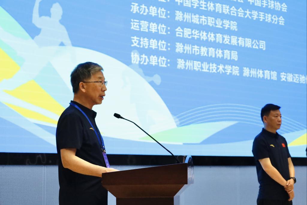 滁州城市职业学院党委书记王燕永致辞,他表示,学校一直致力于体育事业的发展,特别是手球运动。学校积极推广手球文化,开设手球选修课,组建专业手球队伍,建设专业场地,近年来在各类比赛中屡获佳绩,为滁州手球事业的发展做出了积极贡献。他强调,此次承办锦标赛,既是对学校体育工作的肯定,也是学习、交流、提升的一次宝贵机会,学校将全力做好赛事服务和保障工作,确保比赛顺利进行。