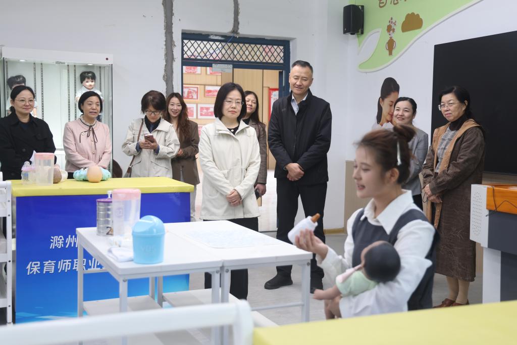 调研期间,董志慧副主席一行首先前往教育学院幼儿照护实训室考察。在现场,调研组细致观摩了幼儿照护实践教学的整个过程,对学校在幼儿照护领域搭建的扎实实训条件,以及在学生培养工作中取得的成效给予了肯定。