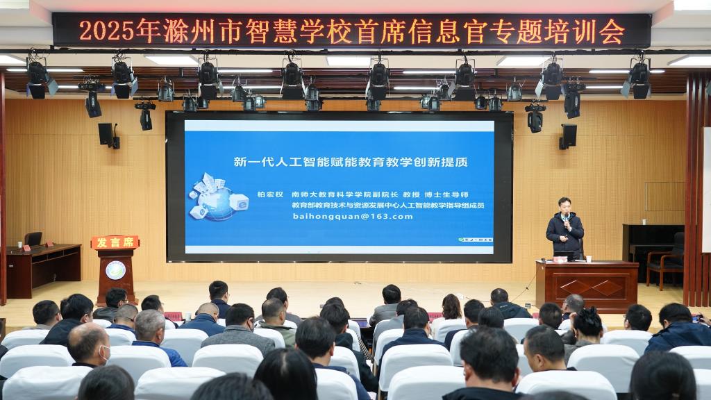 为深入贯彻落实国家教育数字化战略行动部署,加快推进滁州市智慧教育建设,12月1日,由滁州市教育体育局主办、教育学院承办的2025年滁州市智慧学校首席信息官专题培训会在教育学院报告厅顺利开班。校党委副书记、校长汪上出席开班式并致辞,市委教体工委委员、市教体局副局长都兰·沙格尼西出席并作培训动员讲话,来自全市各县(市、区)的中小学校长、首席信息官等教育信息化骨干,我校各二级学院相关负责人参加本次培训。