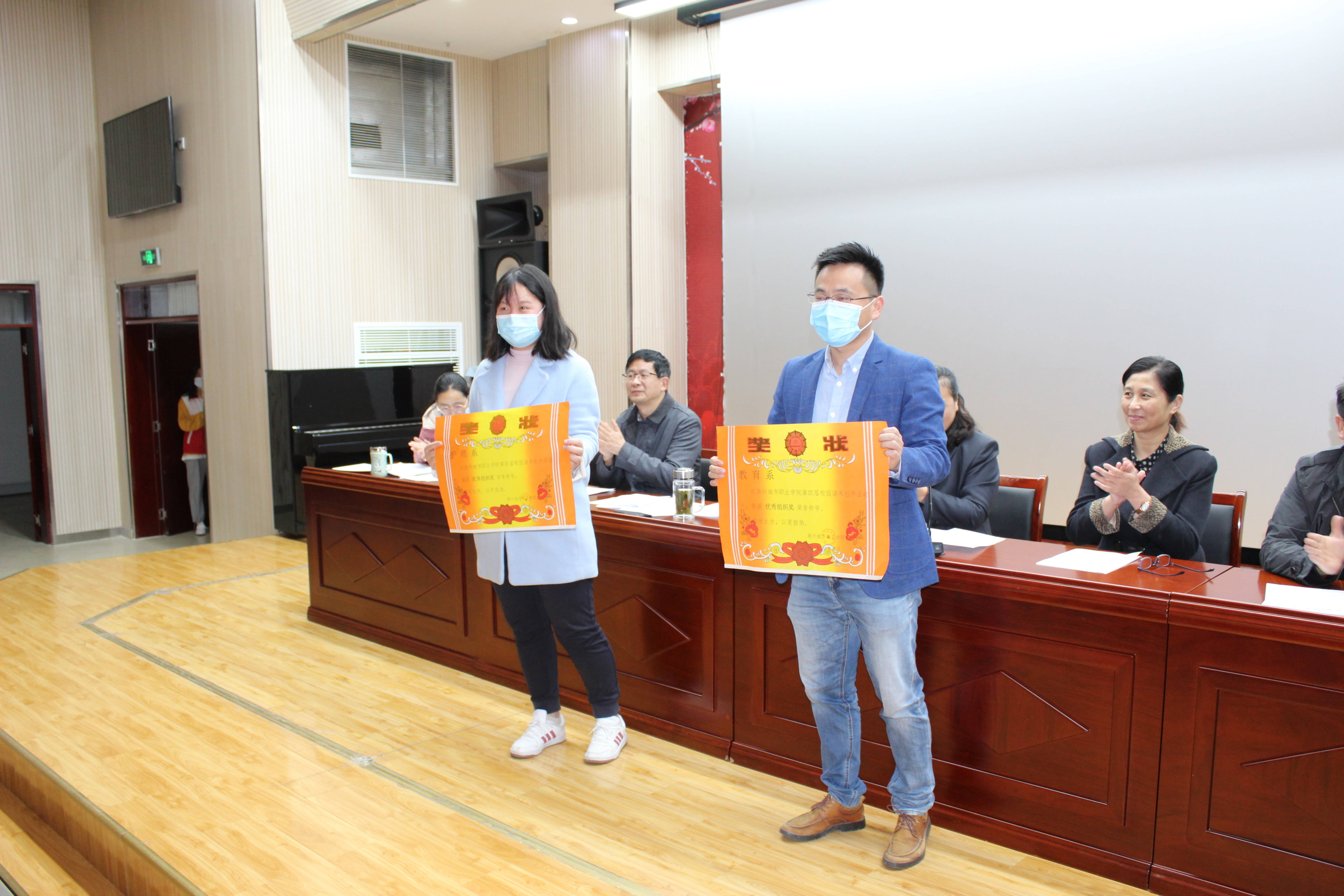 图书馆副馆长吴忠山宣读了第四届校园读书创作、教师“阅读提升”获奖师生名单,到会的各系部、部门负责人向在我院第四届教师“阅读提升”、学院以及省第四届校园读书创作活动中获奖的43名师生颁发了荣誉证书,向荣获学院第四届校园读书创作“优秀组织奖”的护理系、教育系颁发了奖状。