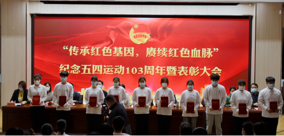 会议在雄壮的国歌中拉开序幕。陈婷婷宣读2021 年度“五四红旗团支部”、 “五四好青年”、“最美志愿者”表彰名单。与会领导为受表彰学生代表颁奖。