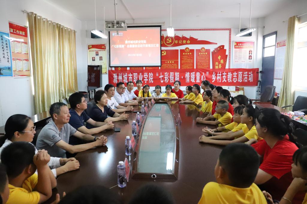 7月9日下午,校党委书记张志华到全椒县大墅小学调研指导护理学院正在开展的“七彩假期”爱心支教活动,全椒县政协主席、大墅产业新城指挥长王春荣,校党委委员、办公室(党委办公室)主任、宣传统战部部长陈通和护理学院党总支书记蔡季秋陪同;大墅镇镇长沐守亮、宣传委员刘玉虹、大墅小学校长徐光辉、小学生代表和志愿者代表参加了汇报会。