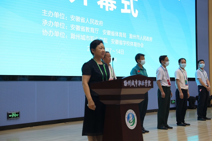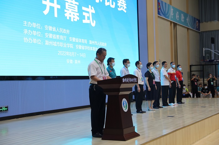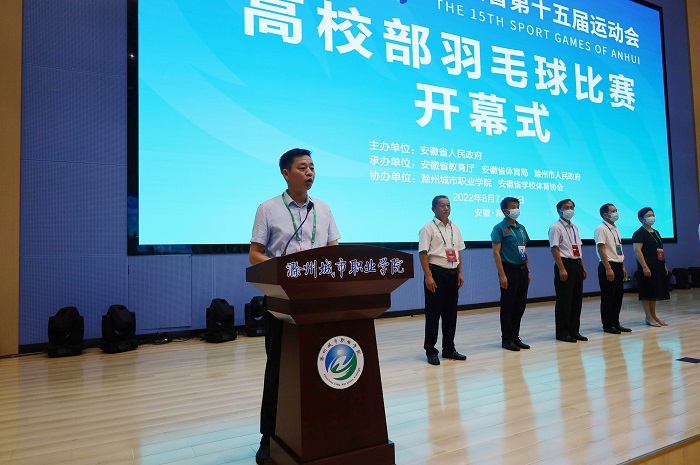 滁州城市职业学院党委书记张志华出席开幕式并宣布开赛,滁州城市职业学院党委副书记、校长汪上,安徽省教育厅体卫艺处副处长葛德连,安徽省教育厅离退休处四级调研员丁仁能,滁州市委教体工委书记、市教体局局长王玉和,省十五运高校部羽毛球比赛监督、安徽农业大学教授陈有忠,省十五运高校部羽毛球比赛仲裁、中国科学技术大学老师王淮勘,省十五运高校部羽毛球比赛裁判长、安徽科技学院体育部主任何俊如出席开幕式。滁州城市职业学院党委委员、校领导施向阳主持开幕式。滁州城市职业学院运动员代表蒋硕代表全体运动员宣誓,裁判员田歆代表全体裁判员宣誓。