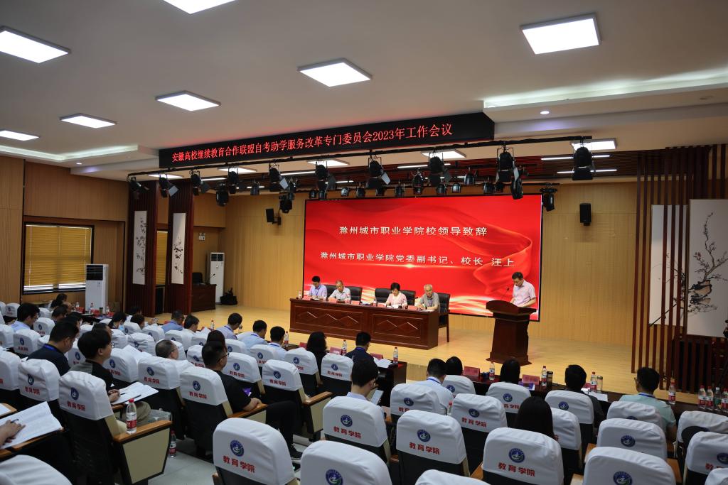 为发挥安徽高校继续教育合作联盟(以下简称“联盟”)桥梁纽带作用,进一步落实联盟2023年重点工作,6月2日,联盟自考助学服务改革专门委员会2023年工作会议在我校召开。合肥工业大学、安徽大学、安徽师范大学、安徽工程大学、合肥职业技术学院、亳州职业技术学院等17所委员单位及19所特邀本专科高校继续教育学院院长及有关人员共67人参会。安徽开放大学党委副书记张敏,滁州城市职业学院党委副书记、校长汪上出席会议并致辞。安徽继续教育网络园区管理中心(联盟常设秘书处)、安徽省终身教育学分银行管理中心负责人及相关人员参加会议并发言。会议由联盟专委会主任委员安徽财经大学继续教育学院院长王浩主持。