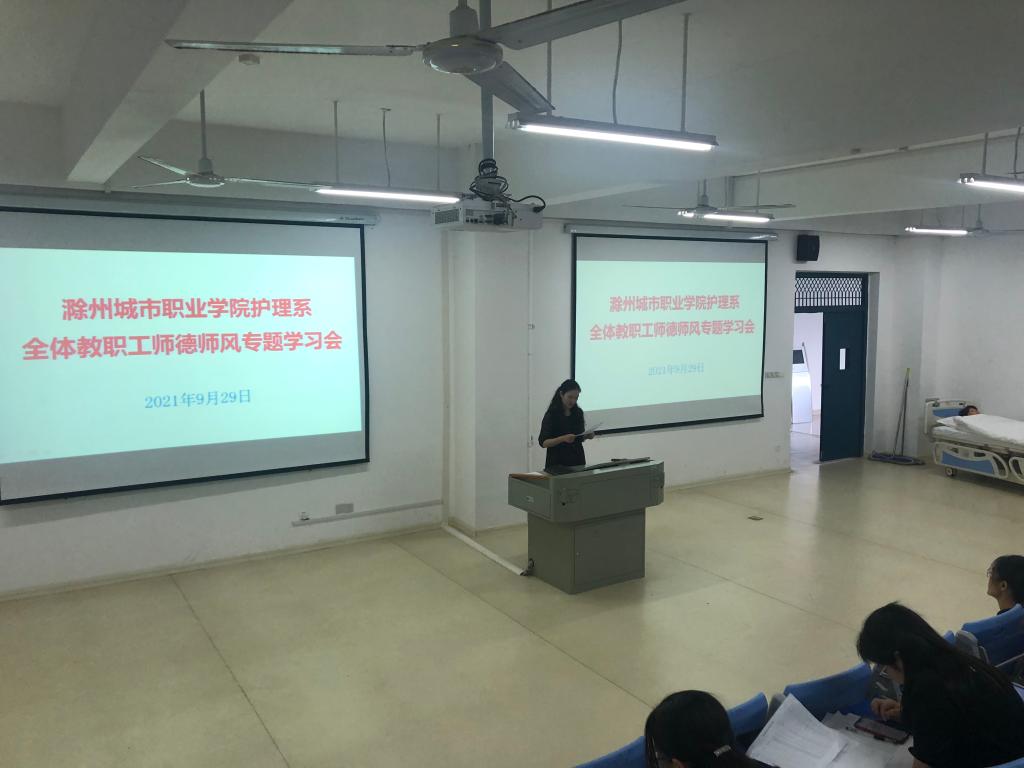 9月29日下午,护理系在B3-211召开师德师风专题学习会,学习贯彻“全省教育系统教师思想政治和师德师风建设视频推进会”精神。会议由系主任章正福主持,系全体教职工参加会议。