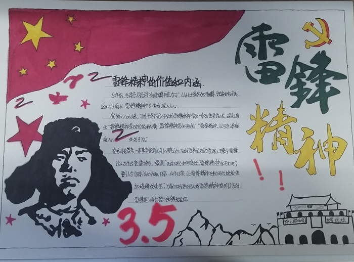 同学们通过各种方式搜索资料,在了解雷锋名言和故事之后,运用自己的聪明才智创作出一张张图案精美、内容丰富的手抄报,用自己的实际行动表达对雷锋的崇高敬意。一幅幅生动的手抄作品,让雷锋精神成为一面面永不褪色的旗帜。