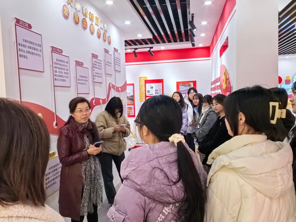 在全椒县党建引领乡村治理主题馆、石沛镇乡村振兴馆,牛春雨结合“习近平新时代中国特色社会主义思想概论”课教学内容,给学生详细讲授基层群众自治制度在乡村治理中是如何运行和实践的,人民群众在基层党组织领导下是如何广泛开展议事协商,实现民事民议、民事民办、民事民管,确保小矛盾小问题不出村,以乡村治理推动乡村振兴的。