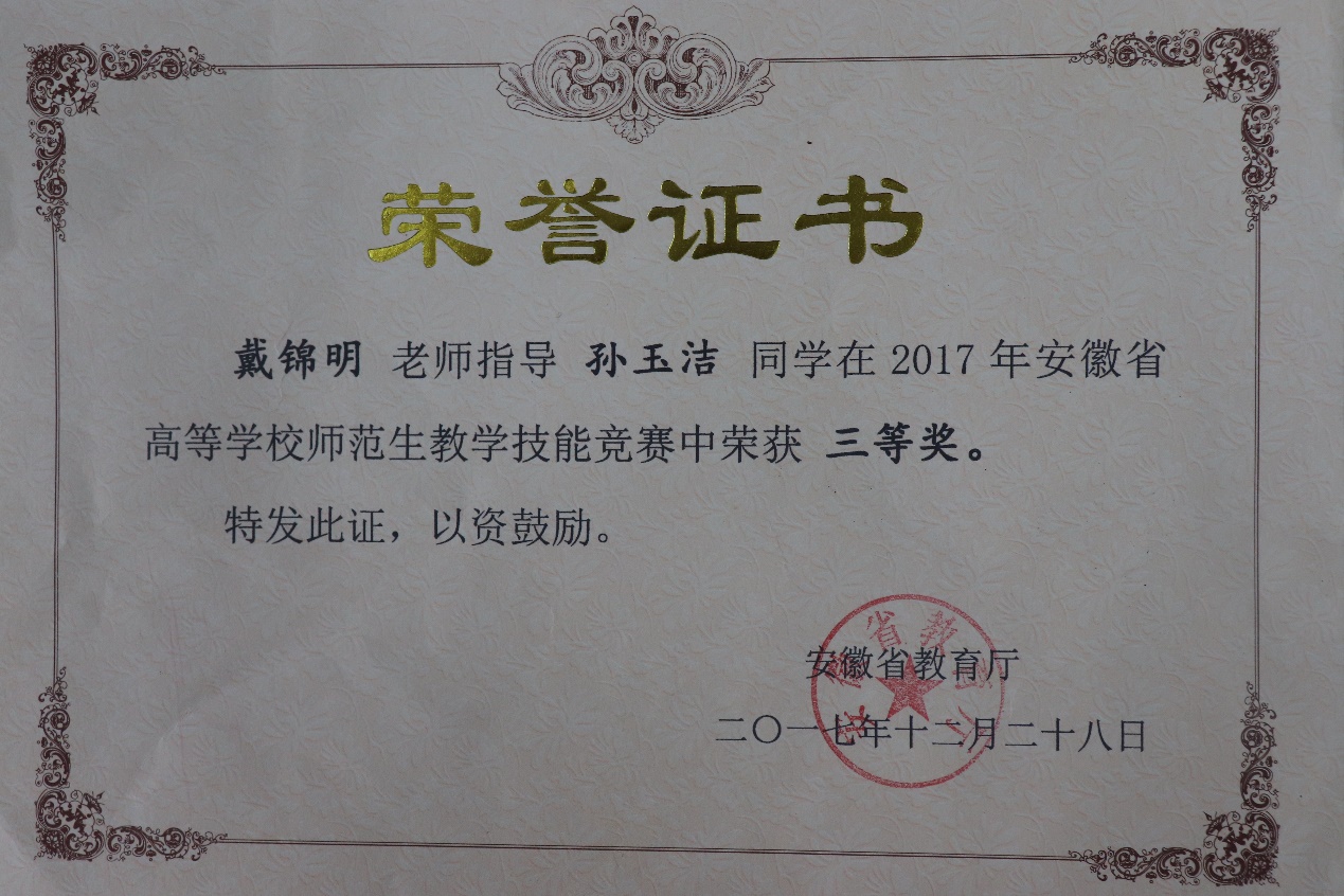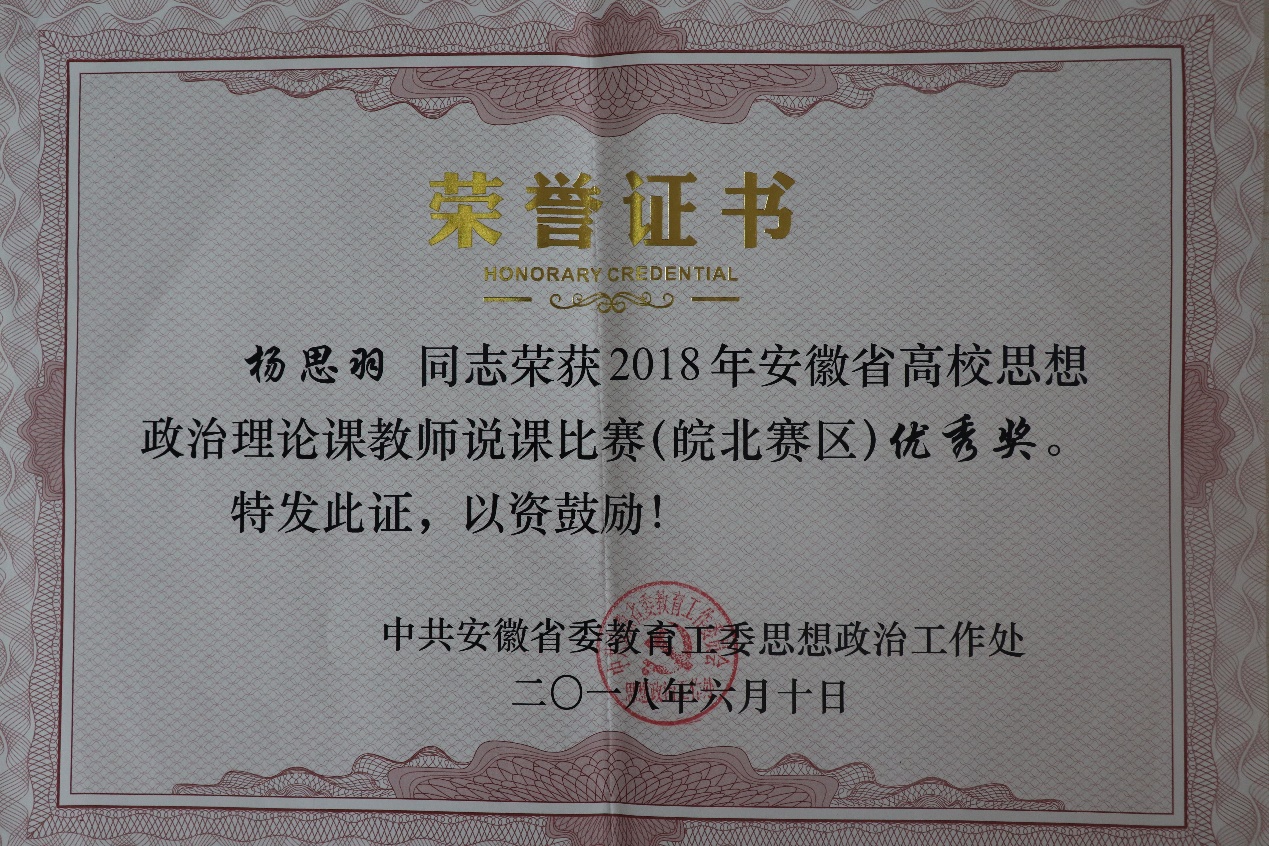 2017年周慧参加全国高校思政理论课教学展示活动获优秀奖; 2018年邵雅黎团队、2019年刘燕燕团队参加学院青年教师教学能力比赛,分别获得二等奖和三等奖;杨思羽老师参加安徽省高校思想政治理论课教师党史说课暨教学展示比赛获皖北赛区优秀奖。