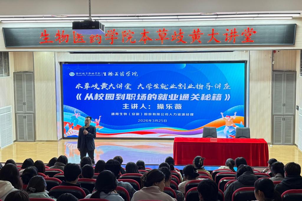 为深化党建引领就业育人,3月25日下午,学院“本草岐黄大讲堂”再次开讲。本次活动特邀通用生物(安徽)股份有限公司人力资源经理操乐薇担任主讲,相关专业学生近200人到场聆听。