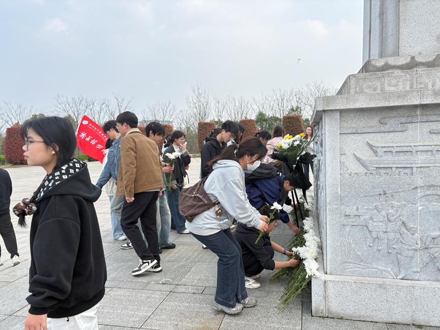 下午2时,镜园革命烈士纪念碑前气氛庄严肃穆。200余名师生整齐列队,齐唱国歌,向革命先烈敬献鲜花、鞠躬默哀。师生们绕行纪念碑,瞻仰烈士纪念碑,镌刻在石碑上的历史与故事,让青年学子深切感受到革命先烈的奋斗精神。