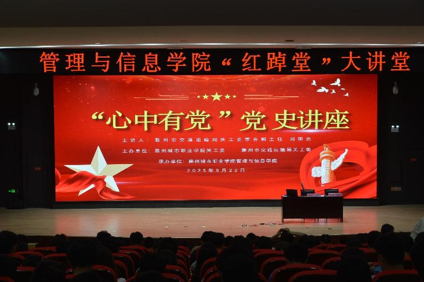 5月22日下午,管理与信息学院开展了“红踔堂”大讲堂活动,此次大讲堂由滁州城市职业学院关工委、滁州市交通运输局关工委、滁州城市职业学院管理与信息学院联合举办。由滁州市交通运输局关工委常务副主任刘明忠担任主讲人,做题为“心中有党”党史专题讲座,滁州城市职业学院关工委副主任汪勇主持讲座。刘明忠主任以深厚的历史积淀和生动的讲述方式,带领师生们回顾了党的峥嵘岁月。从山河破碎时八国联军侵华的惨痛历史,到中国...