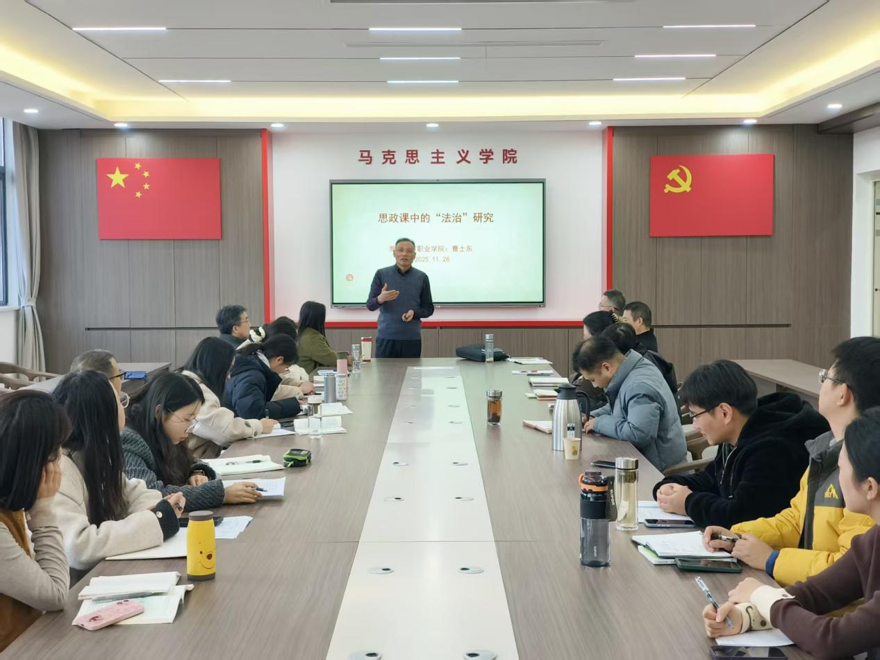 为深入学习贯彻习近平法治思想,破解思政课教学中的难题,11月26日下午,校党委委员、副校长曹士东以“思政课中的‘法治’研究”为题,为马克思主义学院全体党员教师带来了一次内涵深刻、深入浅出的专题讲座。曹士东围绕习近平法治思想的理论研究,从法的含义、特征以及渊源入手,紧扣习近平法治思想的核心要义与实践要求,重点围绕“十一个坚持”,剖析并阐明了习近平法治思想的核心要义、重大意义和科学方法。在此基础上,精...