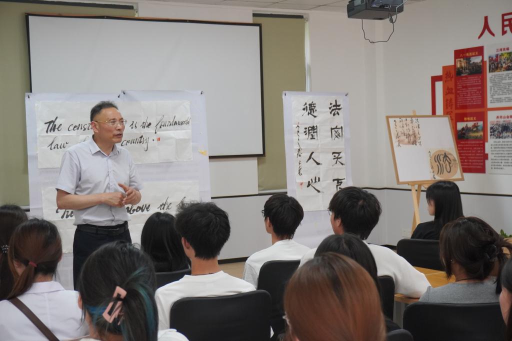 为深入学习贯彻习近平法治思想,全面提升青年大学生法治素养,营造尊崇法治、践行法治的浓厚校园氛围,6月5日下午,校党委委员、副校长曹士东走进“月朵e站”学生社区,为青年法学社成员和班级思政委员带来一场内涵丰富的法治专题讲座。学生处副处长田青青、校团委教师陈冉参加活动。曹士东以深厚的法学功底,从中华法系的历史脉络开篇,生动讲述了商鞅变法开创成文法体系的里程碑意义。他巧妙地将法律与传统书法艺术相联系,阐...