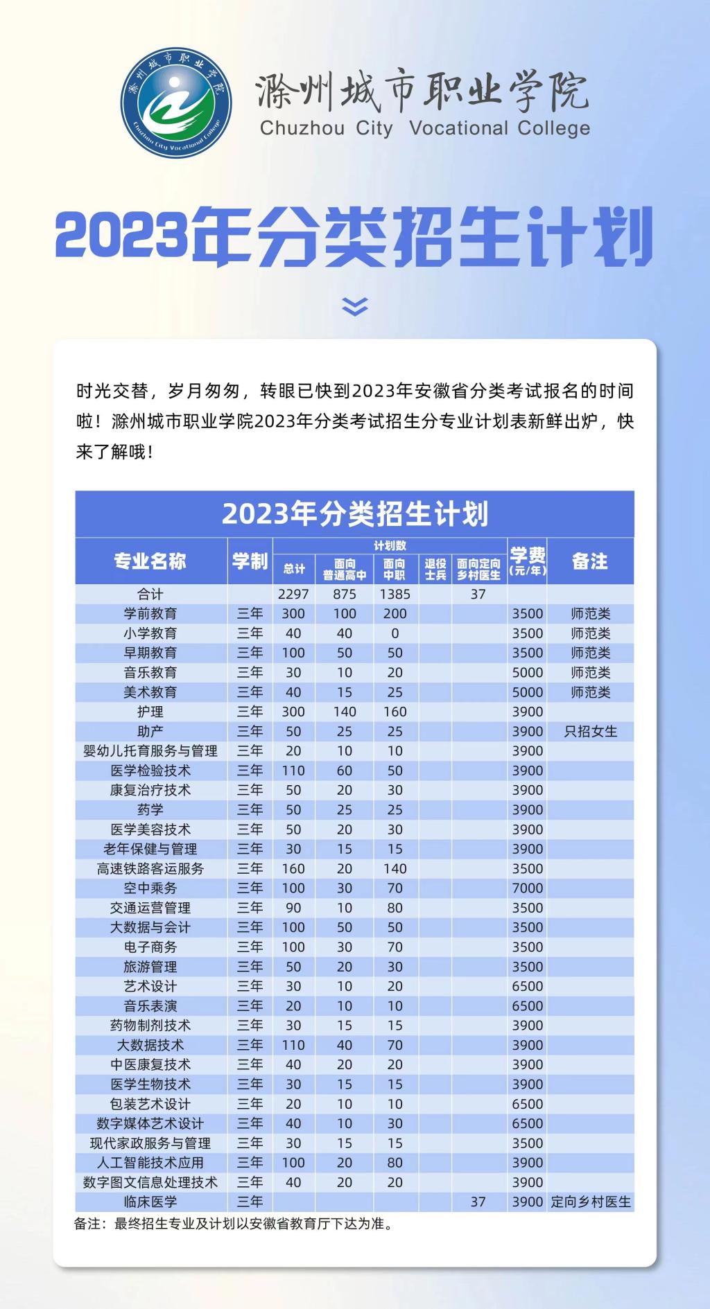 滁州城市职业学院2023年分类招生考试各专业招生计划